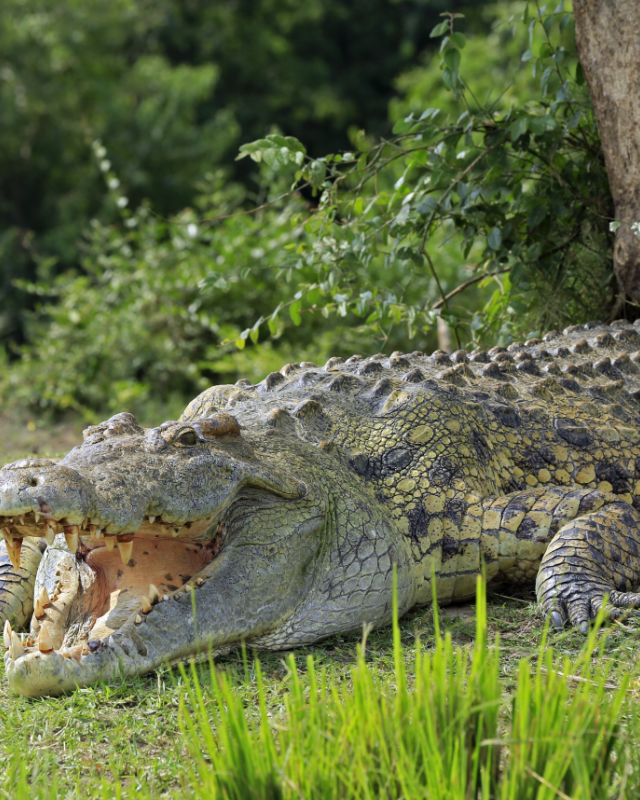 base of the falls. As you travel up the Nile, look at the enormous Nile crocodile basking on the sand banks or gliding silently up the